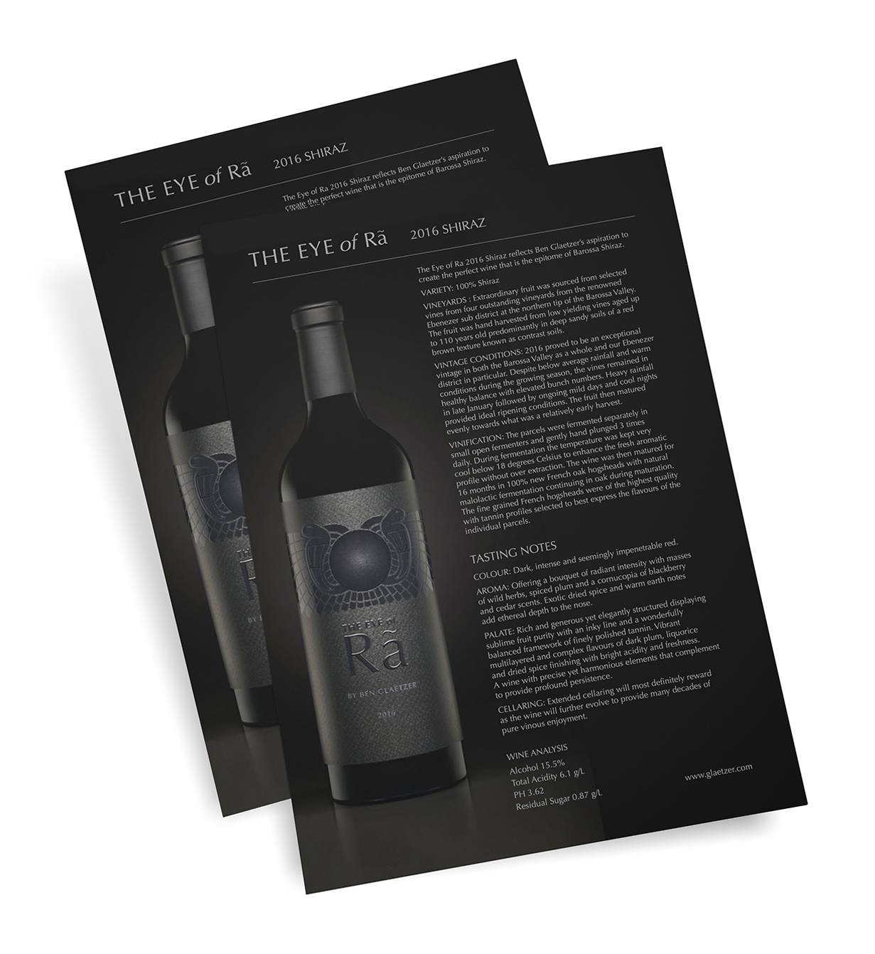 The Shiraz represents the very best of the famed Ebenezer district in the Barossa Valley. The fruit was hand harvested from low yielding, aged vines and offers a bouquet of radiant intensity showing astounding depth and volume. Due to the dark and brooding nature of this wine and the inky depth of colour, it was decided that the design would be ‘black on black’ to express the unique characteristics of the wine.