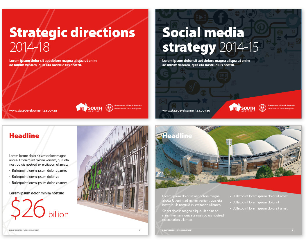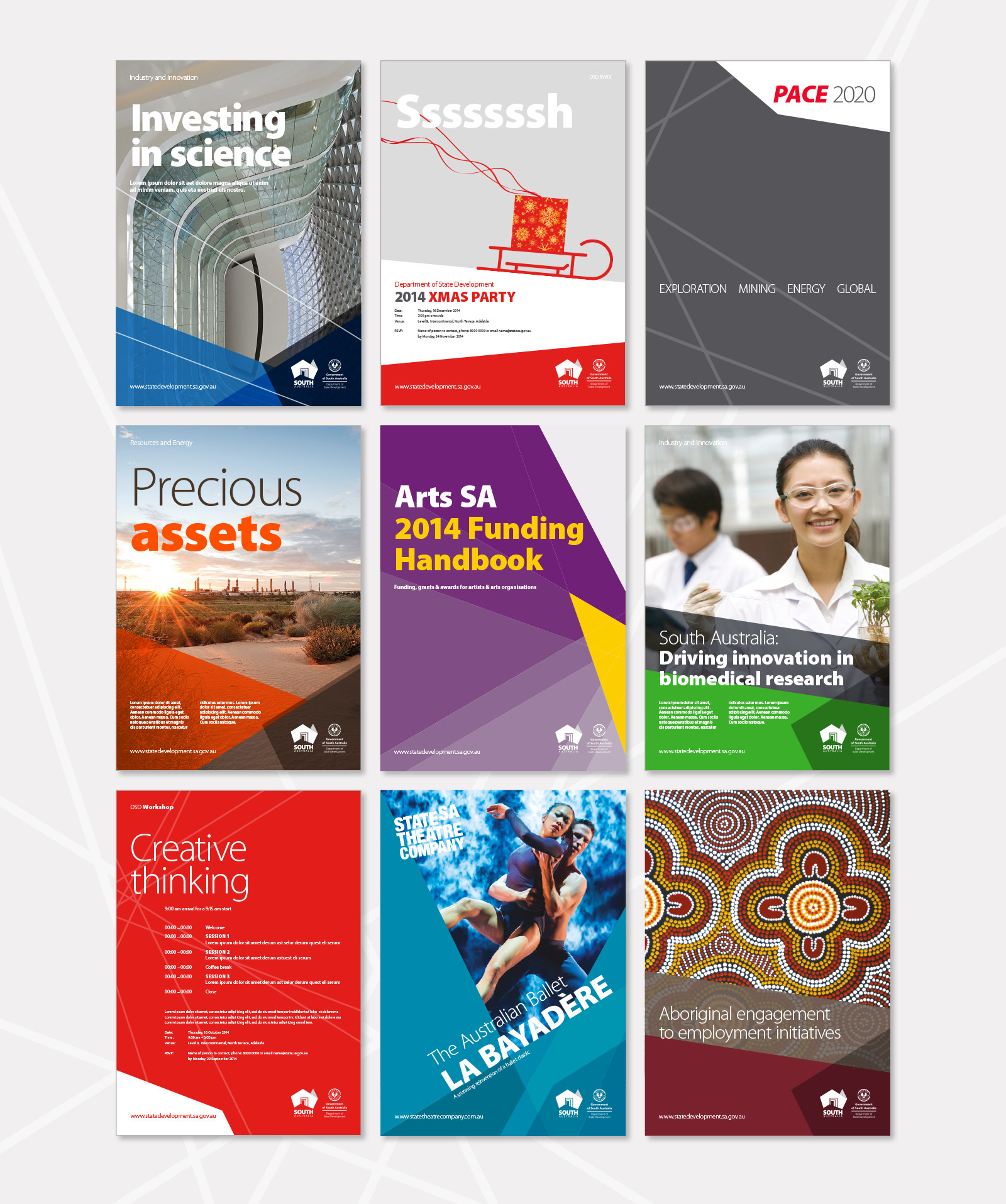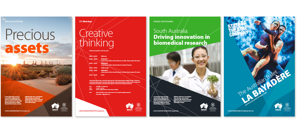 The communication style thematic is derived from the Brand South Australia symbol’s structural framework, edited to a number of prime keylines. The ‘wire frame’ thematic can be used in part or as a whole to build a recognisable but eminently variable ‘look’ and incorporate solid shapes, images and type.