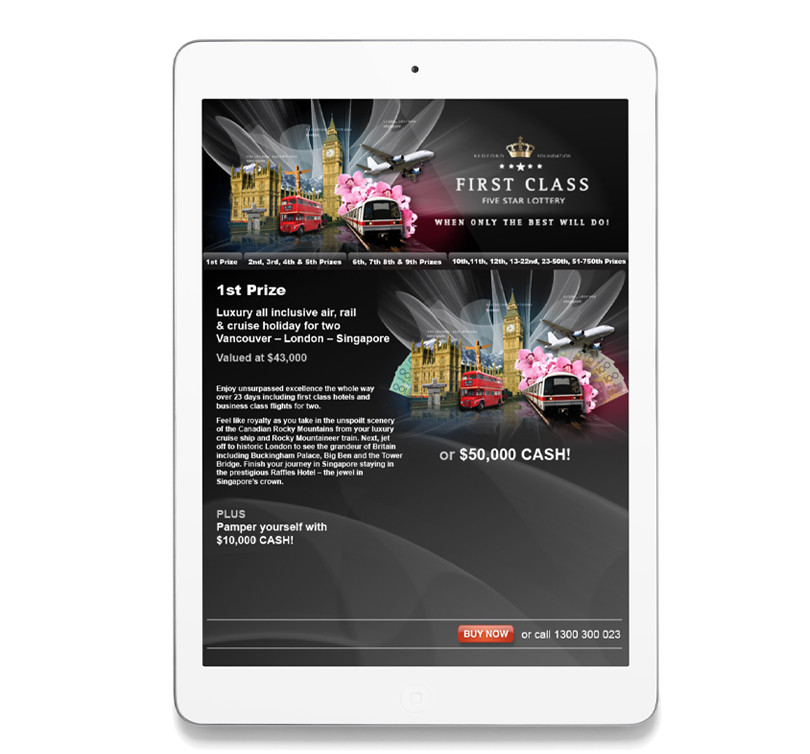 We designed custom thematics for each event based on key prize features and rolled out associated collateral including direct mail, brochures, street banners, tickets and a lottery microsite linked to an online sales portal.