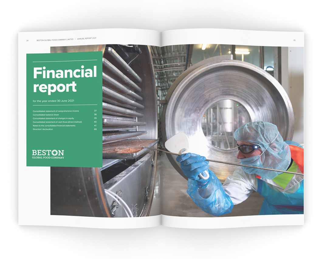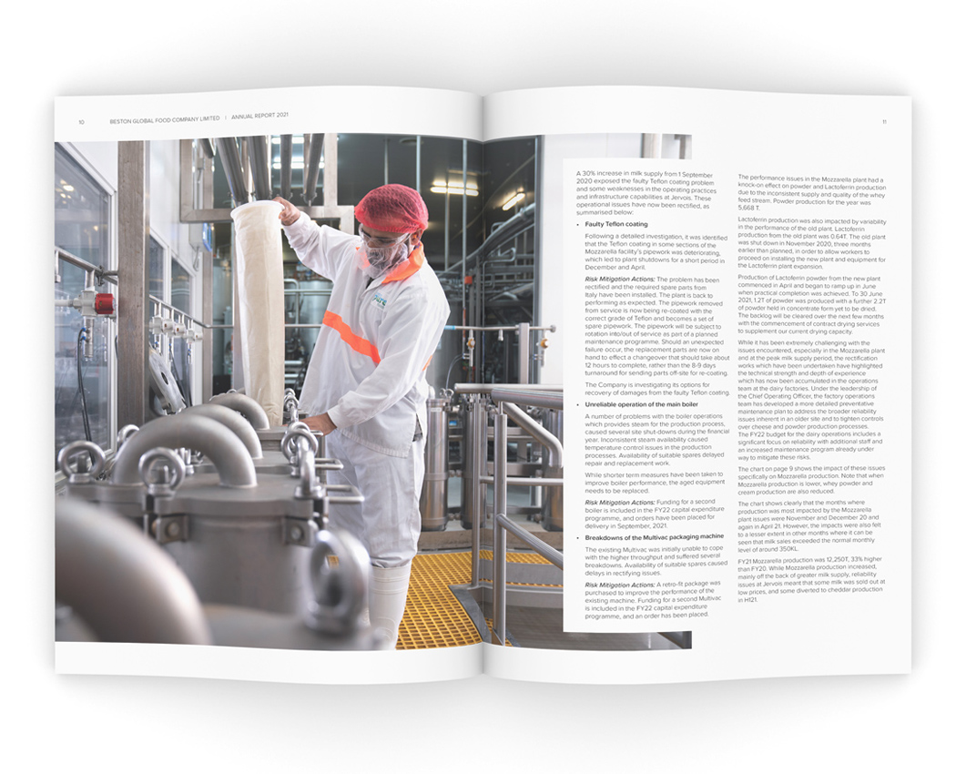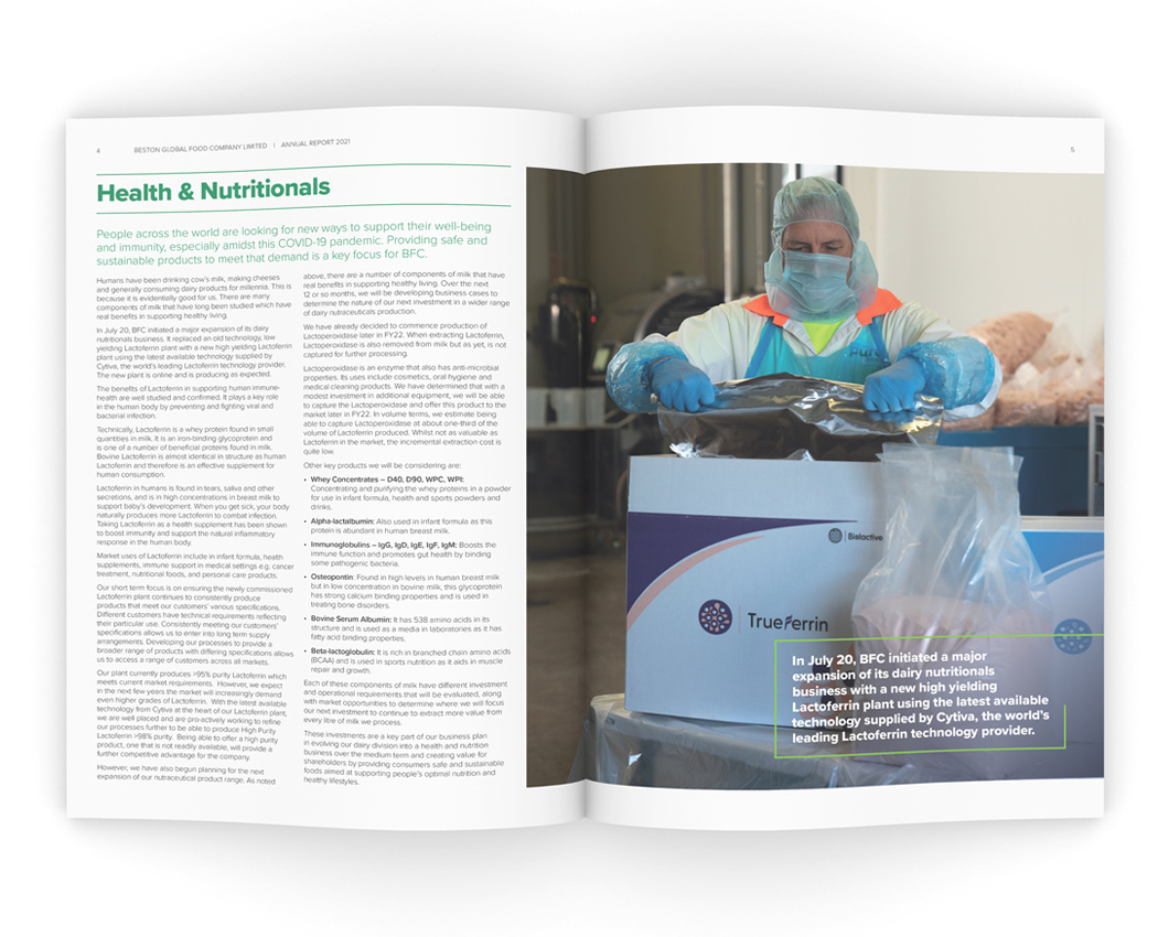 For Beston, the 2021 financial year was one of both resilience in the face of the global COVID-19 epidemic, and growth with the construction of a new Lacoferin plant that will set the company in good stead for the future. The sizeable investment was the main focus for this year's report and we documented the new development, art directing a photoshoot (photography by James Knowler at JKTP) which took in the entirety of the high-tech process.