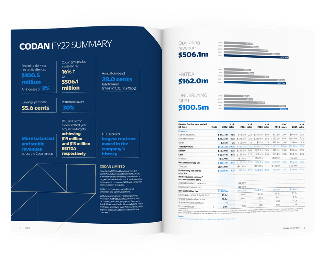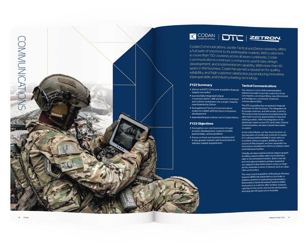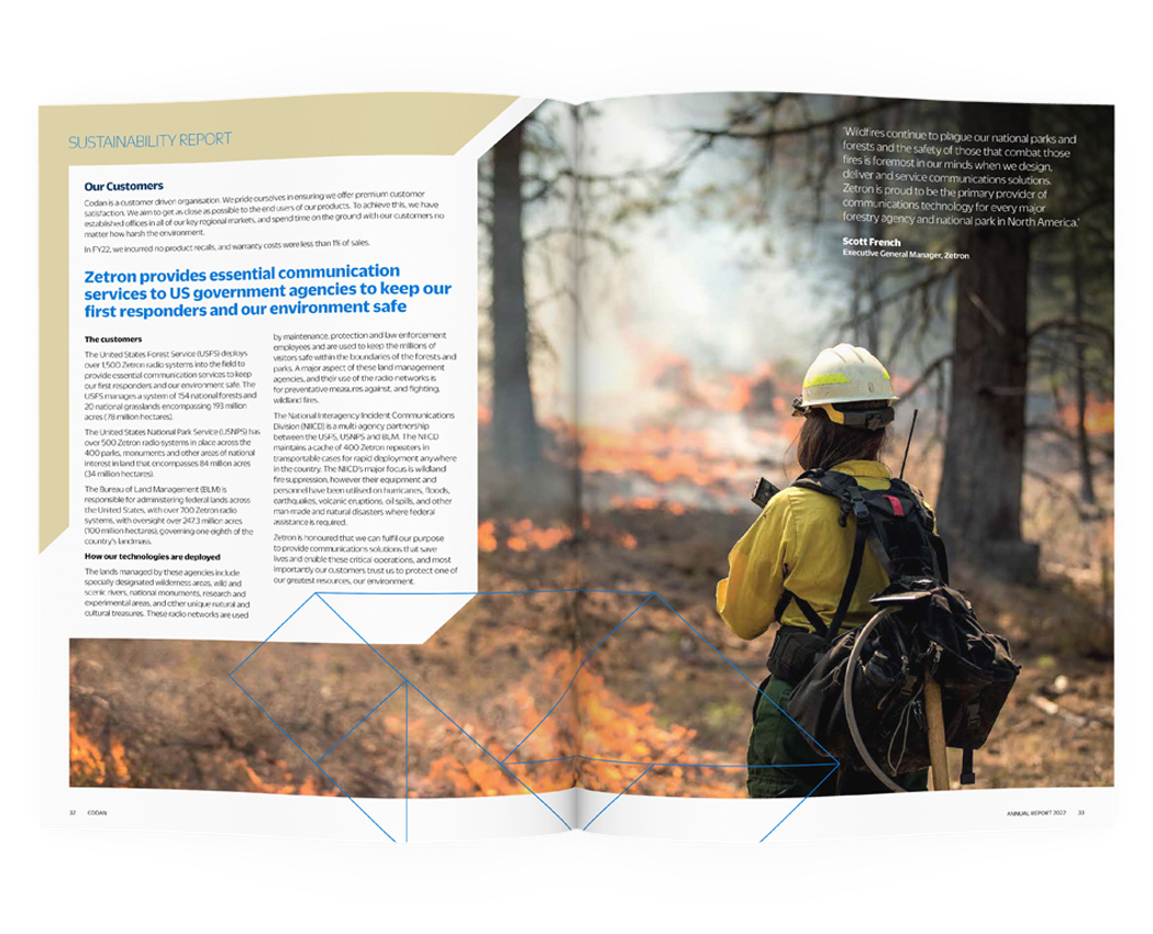 In our sixth year producing Codan’s annual report, the organisation continues to grow with the recent acquisitions of DTC and Zetron now very much fully integrated into the company's offering – providing customers with solutions for communications, safety, security, and productivity problems in some of the harshest environments around the world.